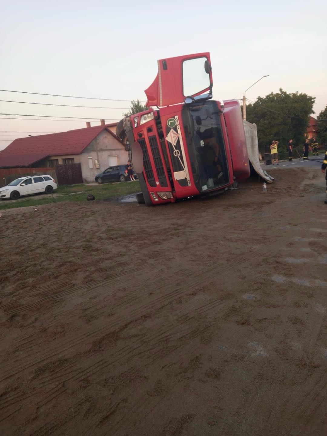 Un autotren încărcat cu nisip s-a răsturnat, miercuri dimineață, pe carosabil. Acesta a blocat DN 6 la ieșire din Remetea Mare spre Izvin, pe ambele sensuri de circulație.