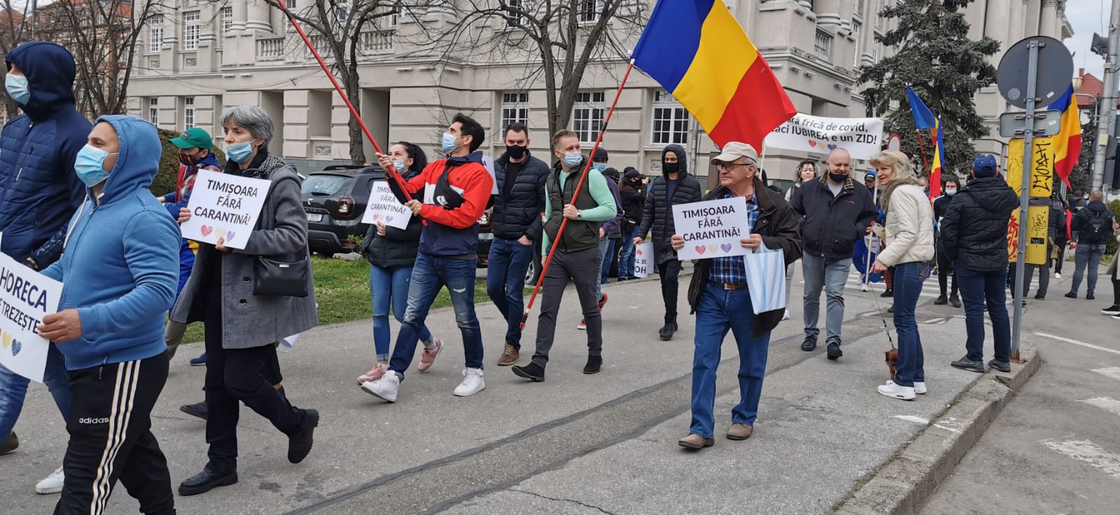 Manifestanții s-au adunat în jurul orei 17 în fața Prefecturii Timiș. Au afișat pancarte pe care scria „Timișoara fără Carantină”, dar și un banner pe care era inscripționat textul „Fără frică de covid, căci IUBIREA e un ZID”. Printre altele, manifestanții au strigat „Sus inimile”, dar și „Să nu uiți, domnule Fritz, Timișoara nu-i Auschwitz”.