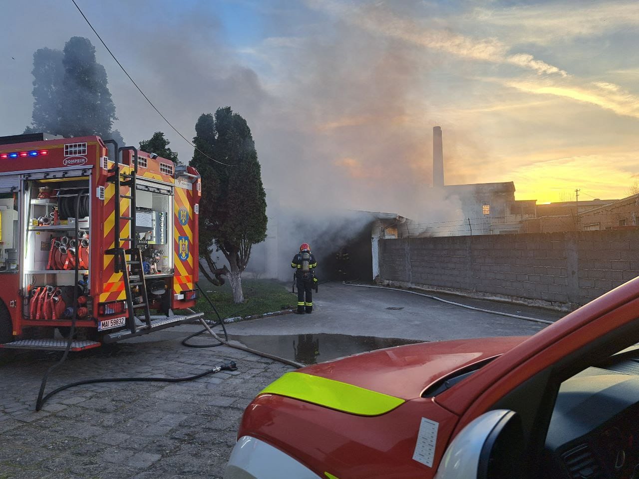 Pompierii au fost solicitați să intervină în jurul orei 17:44, prin apel 112, pentru stingerea unui incendiu izbucnit la o hală de producție în Lugoj (fosta fabrică de pantofi).