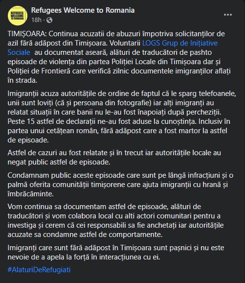 „LOGS Grup de Inițiative Sociale a documentat aseară, alături de traducători de pashto, episoade de violența din partea Poliției Locale din Timișoara, dar și Poliției de Frontieră, care verifică zilnic documentele imigranților aflați în strada. Imigranții acuză autoritățile de ordine de faptul că le sparg telefoanele, unii sunt loviți (ca și persoana din fotografie – n.r.) iar alți imigranți au relatat situații în care banii nu le-au fost înapoiați după percheziții. Peste 15 astfel de declarații ne-au fost aduse la cunoștință. Inclusiv în partea unui cetățean român, fără adăpost, care a fost martor la astfel de episoade”, au transmis pe pagina de Facebook cei de la Refugees Welcome to Romania.