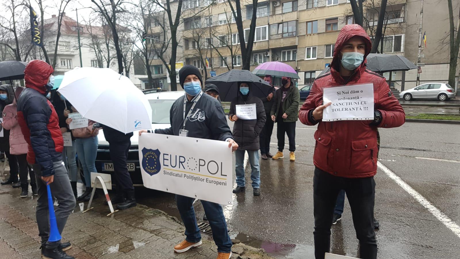 La Timișoara, zeci de oameni ai legii s-au adunat, joi dimineață, în fața Prefecturii Timiș pentru a protesta față de noile măsuri anunțate de guvern. Protestul a fost organizat legal, liderii sindicali obținând autorizație pentru a desfășura manifestația în intervalul orar 10-12.