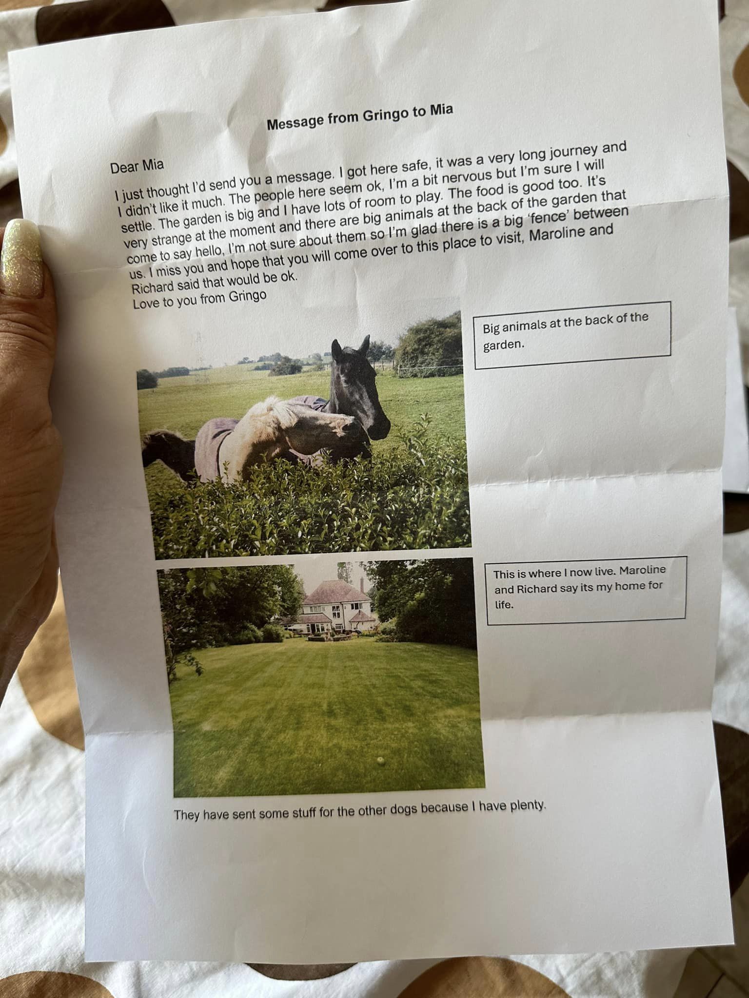 „(…) Pe el l-am preluat atunci traumatizat și extrem de trist, și așa a rămas la noi 2 ani, în care s-a recuperat fizic și psihic, a devenit un câine perfect. Despărțirea de el a fost grea , dar gândul ca a ajuns la cea mai bună familie în Uk, merită totul. Am primit și o scrisoare care ne-a făcut ziua mai frumoasă.