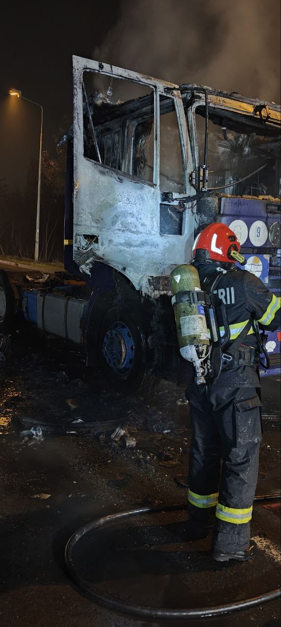„La locul evenimentului s-au deplasat patru autospeciale de stingere din cadrul Detașamentului 1 Timișoara. La sosirea la locul evenimentului s-a constatat că incendiul se manifesta cu ardere generalizată la un cap tractor (nu avea remorcă).