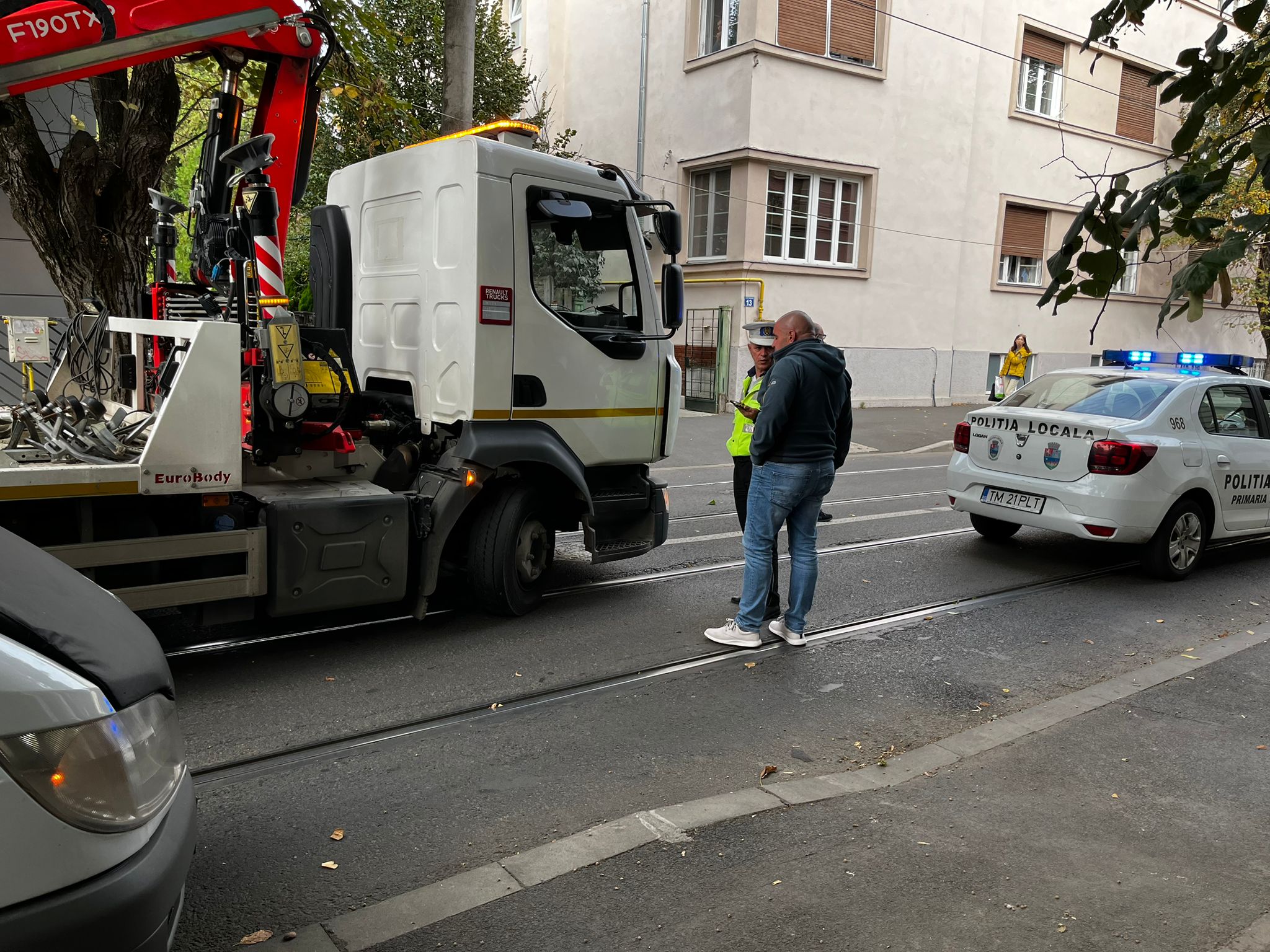 FOTO. Mai multe tramvaie blocate zeci de minute de o șoferiță care a parcat aiurea, la Timișoara