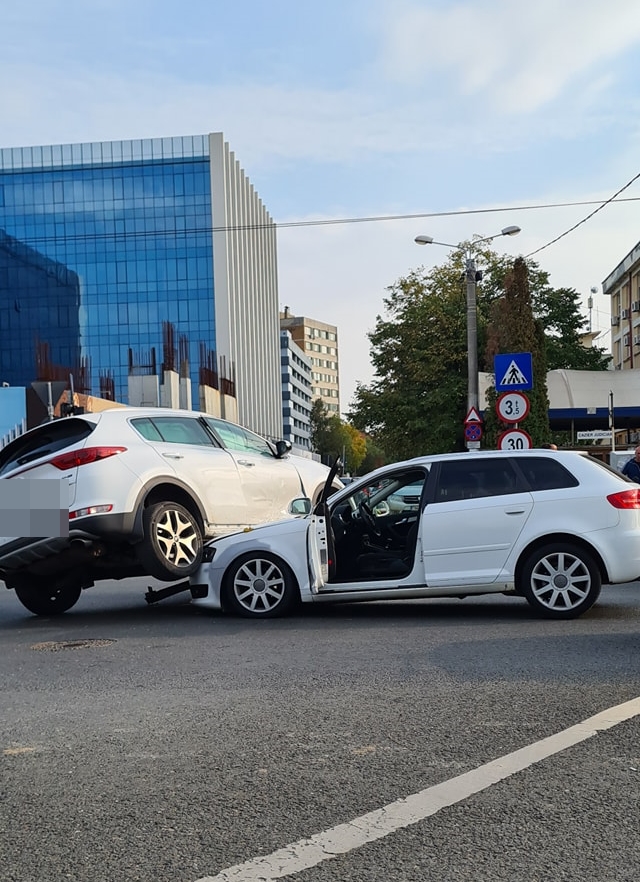 În urma impactului, mașina șoferiței vinovate a fost pur și simplu luată pe sus pe capota celeilalte. Din fericire, accidentul s-a soldat numai cu pagube materiale și nimeni nu a fost rănit.