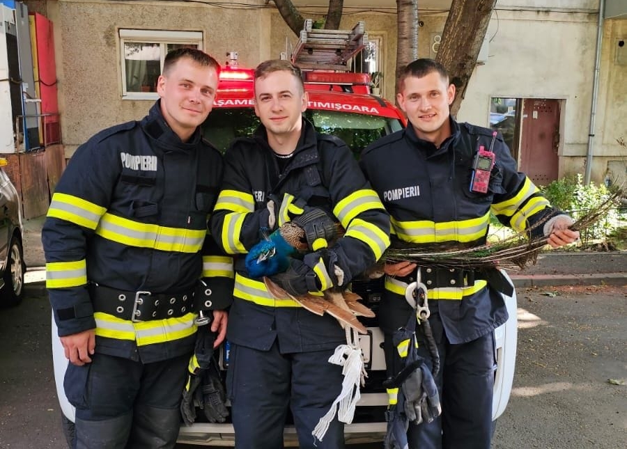 După ce a fost salvat, păunul a fost dus în siguranță la sediul Detașamentului 1 de Pompieri Timișoara și predat apoi către Garda de Mediu Timiș.