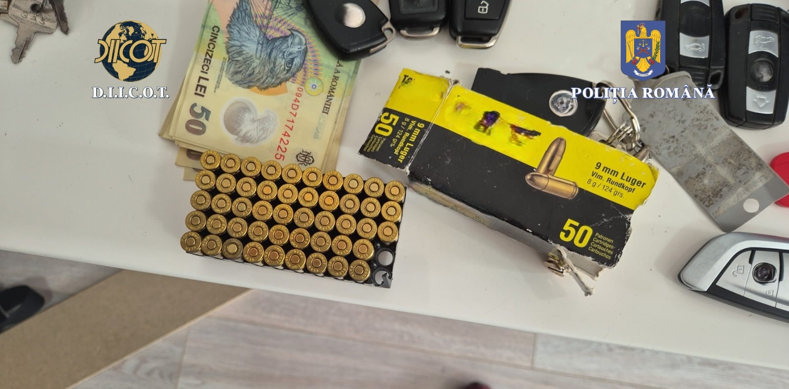 În urma celor șapte de percheziții domiciliare efectuate, au fost identificate și ridicate peste 5.245.000 de țigarete netimbrate ascunse într-un imobil și o remorcă frigorifică, 48 cartușe calibru 9 mm, precum și altele.