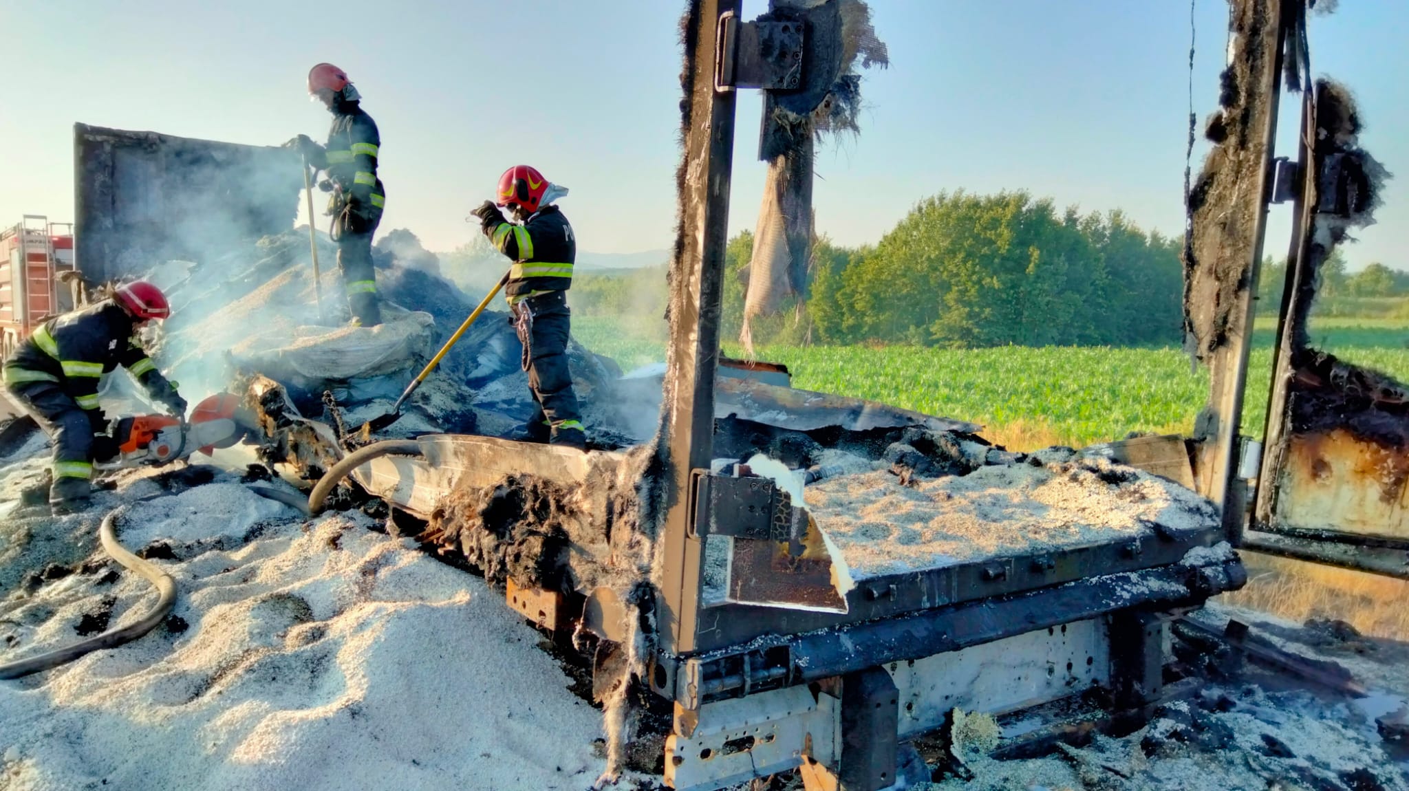 Incendiul a fost anunțat în dispeceratul ISU Banat în noaptea de joi spre vineri, în jurul orei 2. Salvatorii au fost chemați să intervină după ce flăcările au cuprins un tir aflat în mers pe A1, pe sensul de mers spre Deva.