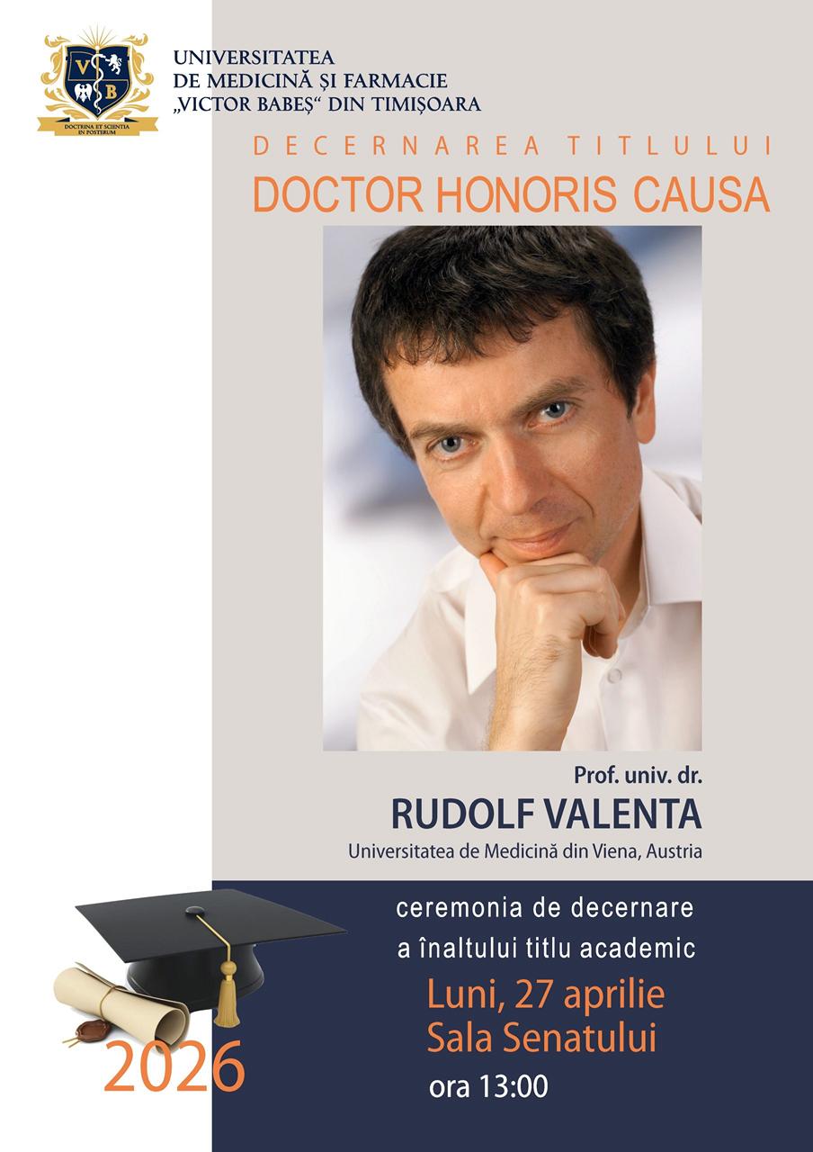 Universitatea de Medicină și Farmacie „Victor Babeș” din Timișoara va organiza, în această lună, ceremonia de decernare a titlului de Doctor Honoris Causa profesorului universitar doctor Rudolf Valenta, profesor de alergologie la Universitatea de Medicină din Viena și coordonator al Departamentului de Imunopatologie din cadrul Institutului de Fiziopatologie și Cercetare în Alergologie.
