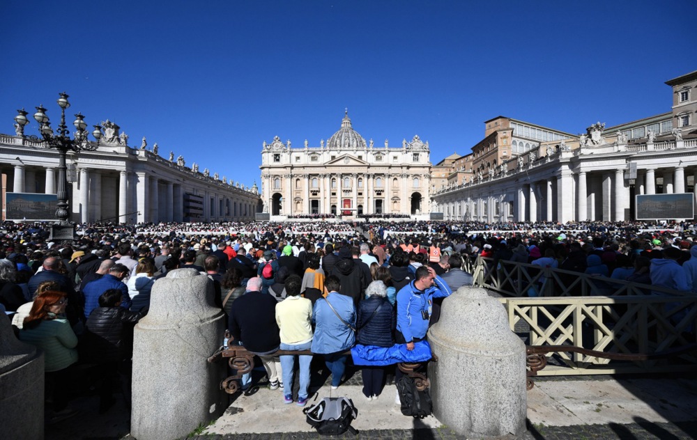 Piața Sfântul Petru nu este complet plină deoarece autoritățile au dorit să limiteze numărul participanților, pentru a putea menține siguranța. Mulți credincioși se află în spatele barierelor, pe străzile din apropiere.