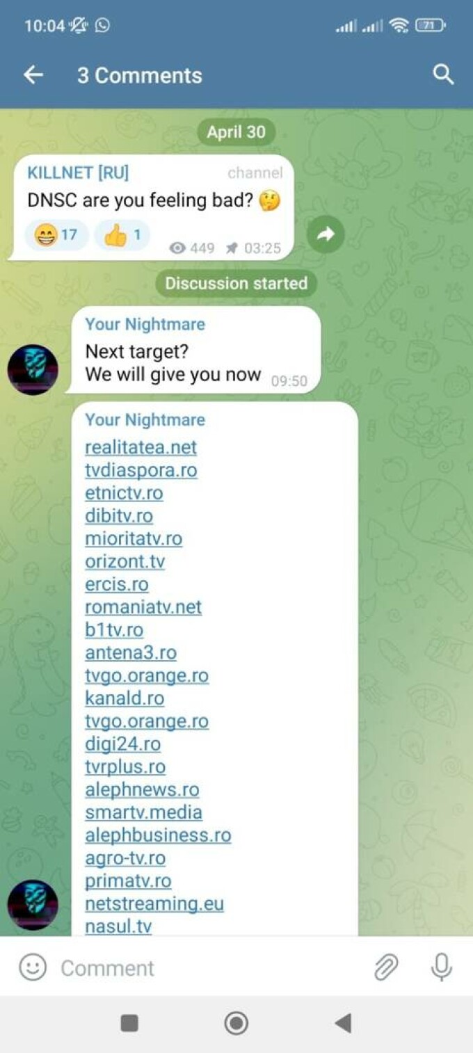 DNSC face aceste recomandări în contextul în care o grupare de criminalitate cibernetică a publicat pe canalul de Telegram propriu informaţia că s-ar afla în spatele mai multor atacuri şi, totodată, a postat o listă de site-uri web din România (instituţii, media, partide politice, business, cultură, etc.) care, spun ei, vor fi în aceste zile noi ţinte ale atacurilor de tipul distributed denial of service (DDoS)”, au transmis autorităţile.