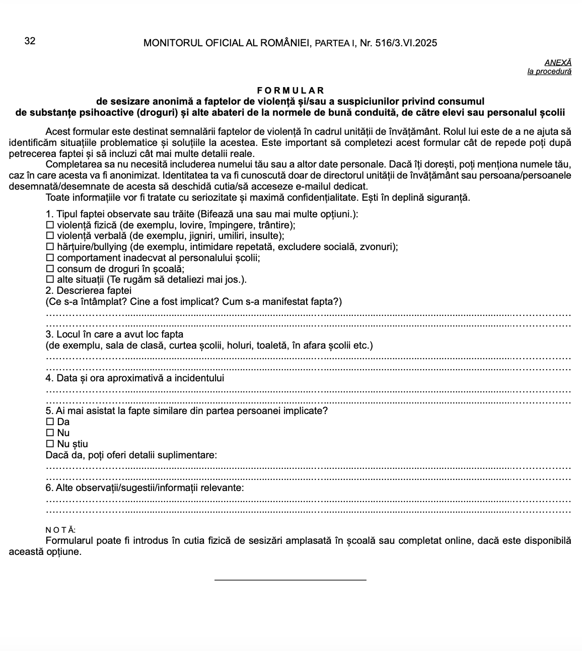 Formularul este conceput pentru a putea fi completat fără a menționa identitatea persoanei care sesizează. Dacă totuși cineva alege să-și expună identitatea, aceasta va fi anonimizată și va fi cunoscută doar de către directorul școlii sau persoanele desemnate să gestioneze sesizările.