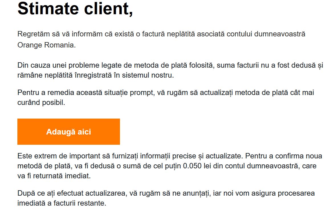 Cei de la Orange spun că mai mulți clienți ai companiei au sesizat că au primit recent mesaje false, pe e-mail, în care erau anunțați că au facturi neplătite.