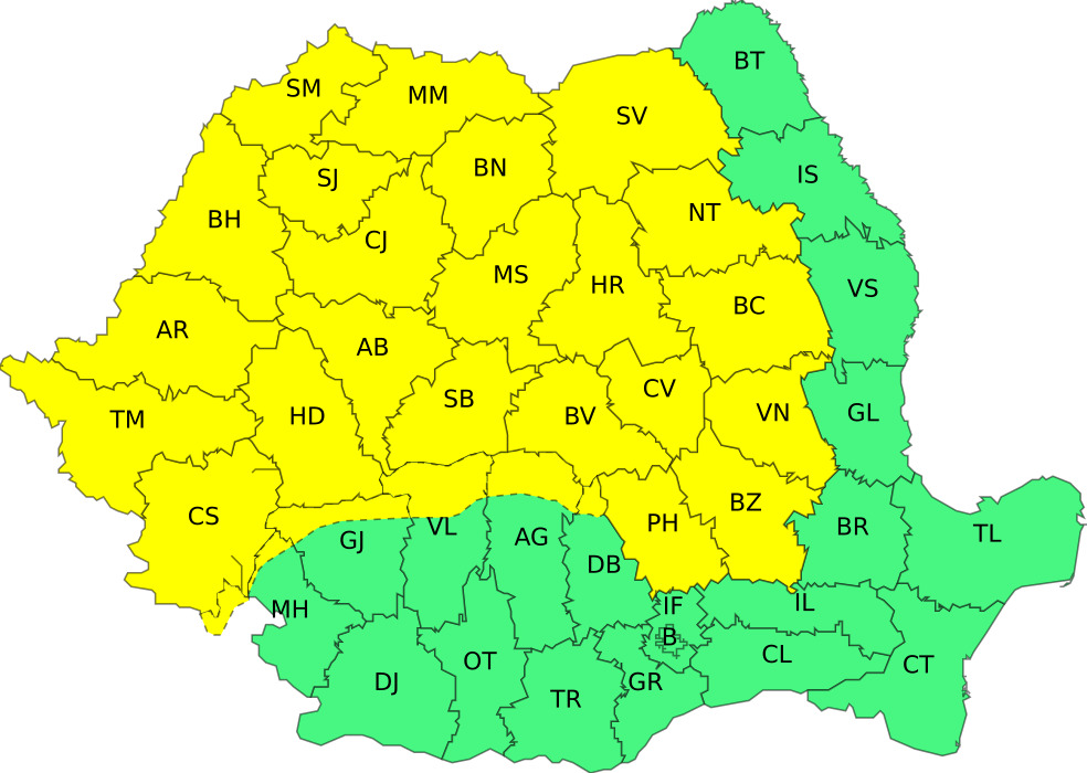 Județele vizate de această atenționare sunt: Alba, Argeș, Arad, Bacău, Bihor, Bistrița-Năsăud, Brașov, Buzău, Cluj, Caraș-Severin, Covasna, Dâmbovița, Gorj, Hunedoara, Harghita, Mehedinți, Maramureș, Mureș, Neamț, Prahova, Sibiu, Sălaj, Satu Mare, Suceava, Timiș, Vâlcea și Vrancea. Totuși, manifestări ale instabilității atmosferice se pot înregistra și în restul țării, dar pe arii mai restrânse.