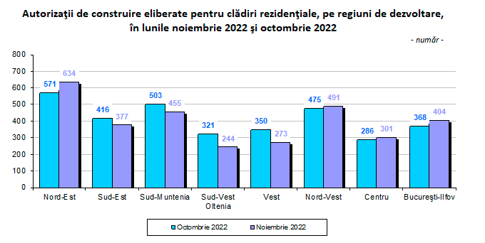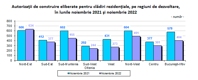 „În luna noiembrie 2022 se evidenţiază o scădere a numărului de autorizaţii de construire eliberate pentru clădiri rezidenţiale (-111 autorizaţii), comparativ cu luna precedentă. În profil teritorial, această scădere este reflectată în următoarele regiuni de dezvoltare: Sud-Vest Oltenia şi Vest (-77 autorizaţii, fiecare), Sud-Muntenia (-48) şi Sud-Est (-39). Creşteri s-au înregistrat în următoarele regiuni de dezvoltare: Nord-Est (+63 autorizaţii), Bucureşti-Ilfov (+36), Nord-Vest (+16) şi Centru (+15)”, se arată în raportul INS.