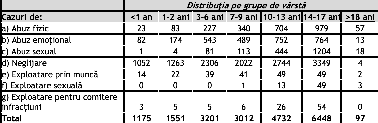 Situația este cu atât mai gravă în rândul copiilor foarte mici. În 2024, aproape 6.000 de victime aveau sub 6 ani, dintre care 1.175 de copii mai mici de un an. În această grupă de vârstă au fost înregistrate cazuri de abuz fizic, emoțional, neglijare și chiar abuzuri sexuale.