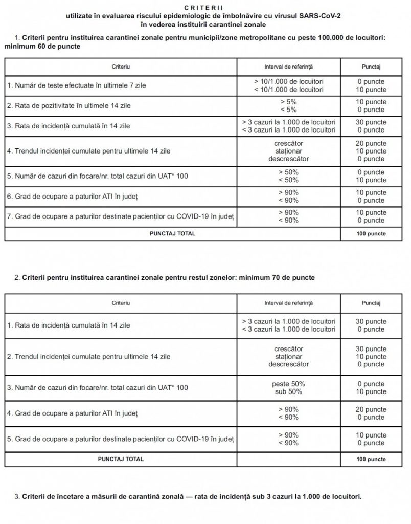 Municipiile și zonele metropolitane cu peste 100.000 de locuitori riscă să intre în carantină dacă au minimum 60 de puncte, iar restul localităților dacă au minimum 70 de puncte. Rata de incidență cumulată în 14 zile de la care se poate institui carantina este de 3 cazuri la o mie de locuitori.