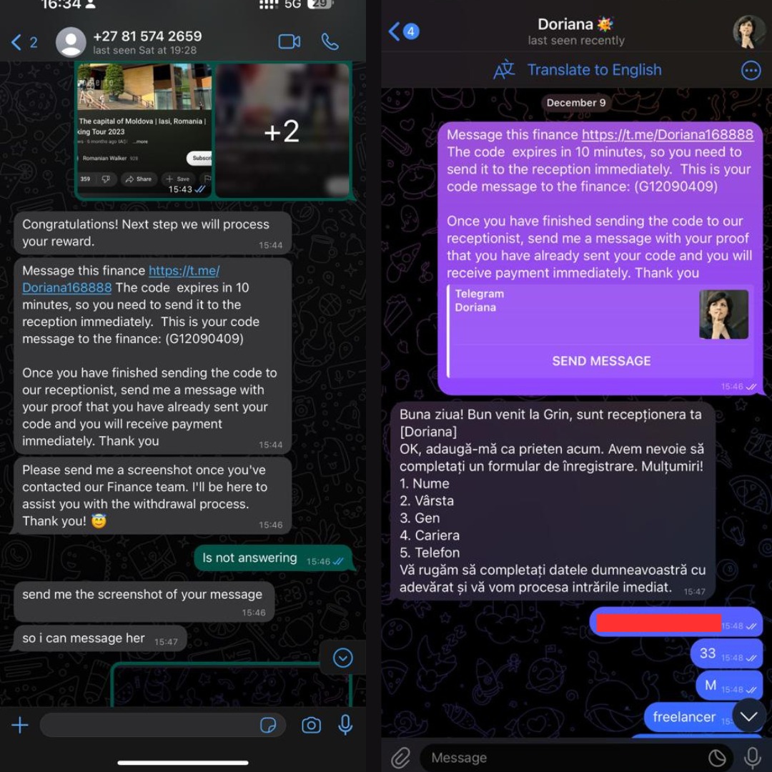 „Pentru a-i convinge de legitimitatea acestei șanse de a face rapid bani, după trimiterea dovezilor, atacatorii transmiteau în conturile interlocutorilor care au completat acestă sarcină o anumită sumă de bani. Însă, pentru a obține banii corespondenți task-ului prestat, erai redirecționat către un canal de Telegram pentru a menționa un cod care ar fi validat faptul că ai dus la îndeplinire sarcina.