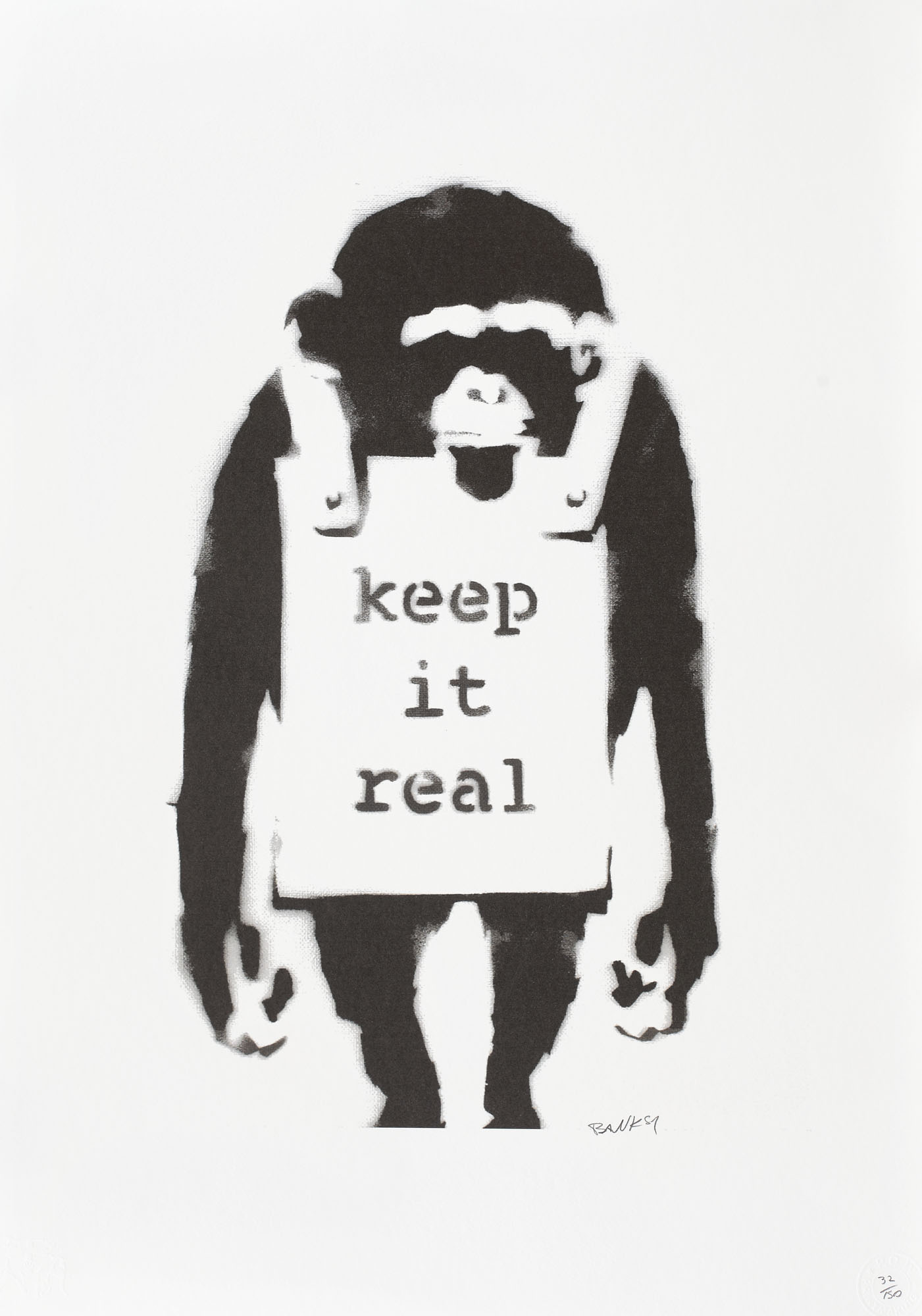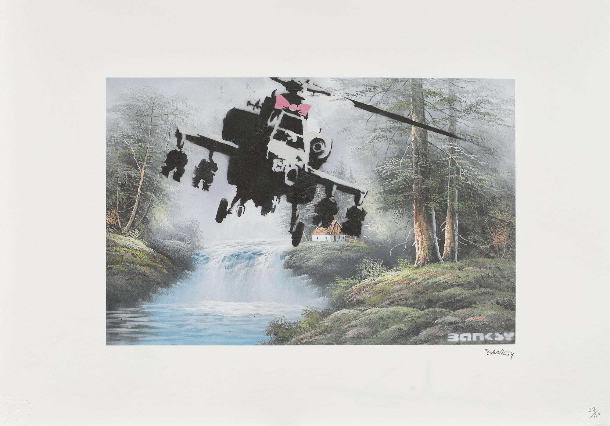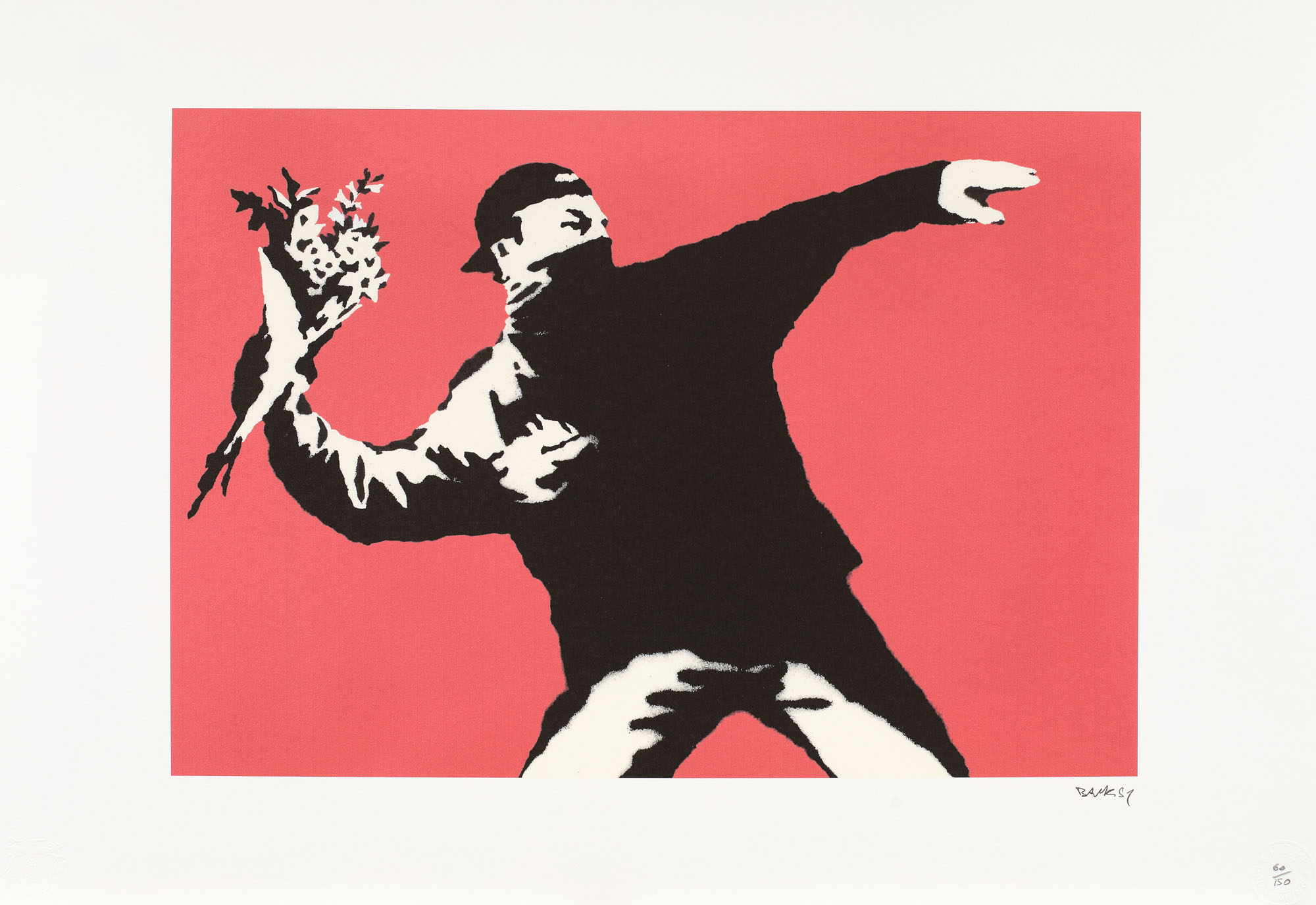 Alte cromolitografii semnate de Banksy care vor fi scoase la licitație joi sunt: „Love is in the air”, „Keep it real”, „Bomb hugger”, „Petrol corupt” sau „Polițistul vesel”.