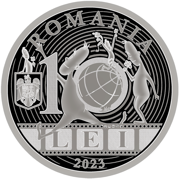 Aversul monedei redă personajul de animație creat de Ion Popescu-Gopo (Omulețul) reprezentat în mai multe ipostaze, alături de globul pământesc și o peliculă de film, inscripția „ROMANIA” în arc de cerc, stema României, valoarea nominală „10 LEI” și anul de emisiune „2023”.