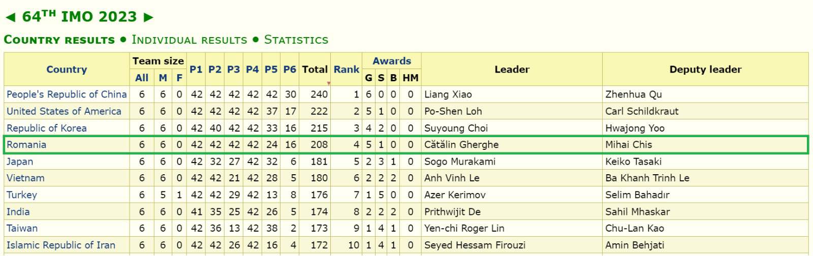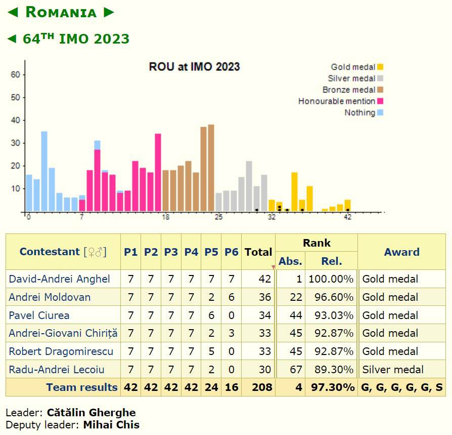 Toate cele trei probleme din prima zi au fost făcute perfect de cei 6 elevi români, iar un elev, David Anghel, a rezolvat toate problemele în toate zilele, cu punctaj maxim, a declarat profesorul Cătălin Gherghe, unul din coordonatorii lotului, care spune despre multiplele rezultate istorice, consideră el.