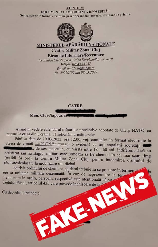 „Precizăm cât se poate de clar că Ministerul Apărării Naționale nu solicită astfel de date persoanelor fizice sau juridice și nu trimite înștiințări către populație în formele în care sunt redactate aceste false adrese. Singura situație în care cetăţenii încorporabili sau rezerviştii pot primi ordine de chemare pentru prezentarea la centrele militare este prevăzută de Legea nr. 446/2006 privind pregătirea populației pentru apărare, care, la articolul 51, menționează că „centrele militare pot chema recruţii şi militarii rezervişti pentru precizarea unor date în legătură cu situaţia lor militară o dată pe an”. Această procedură nu vizează toți rezerviștii și se desfășoară în fiecare an, fără să aibă legătură cu situația de securitate din Ucraina. Aceste ordine de chemare sunt înmânate, conform prevederilor art. 45, alin. (1) lit. a) din aceeași lege, de către reprezentanții structurilor specializate ale Ministerului Afacerilor Interne”, au declarat reprezentanții MApN pe rețelele de socializare.