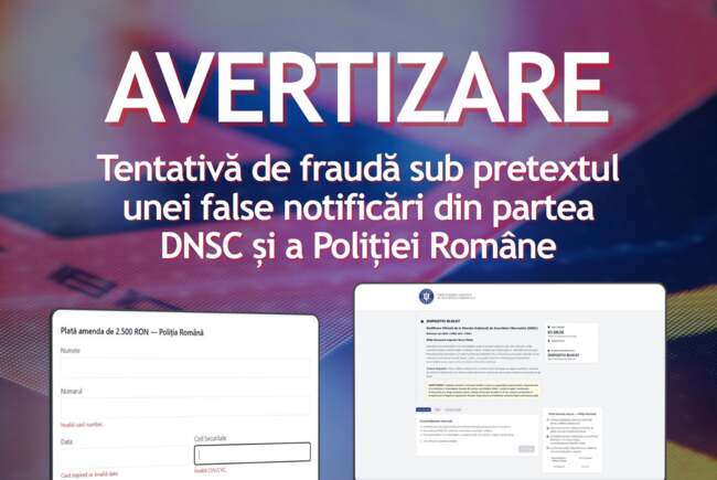 Directoratul Național de Securitate Cibernetică avertizează că o nouă tentativă de fraudă circulă online: utilizatorii sunt speriați cu o notificare falsă care îi anunță că au primit o „amendă” de 2.500 lei din partea Poliției Române și a DNSC, iar apoi sunt redirecționați către un site unde li se cer datele de card.