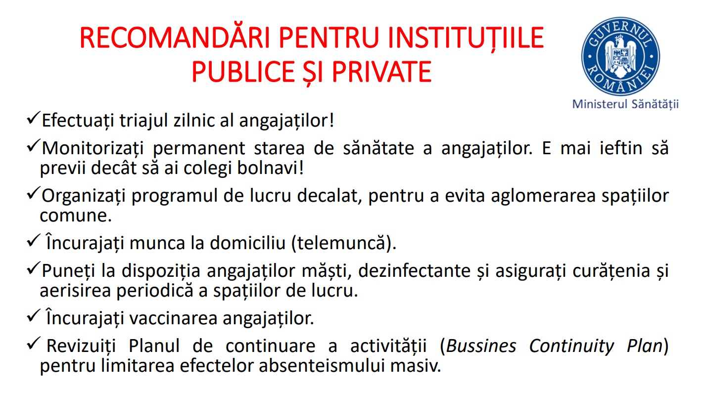 Ministerul Sănătății încurajează munca la domiciliu, triajul epidemiologic zilnic al angajaților și programul de lucru decalat, astfel încât să fie evitată aglomerarea spațiilor comune. Sunt câteva dintre recomandările făcute.