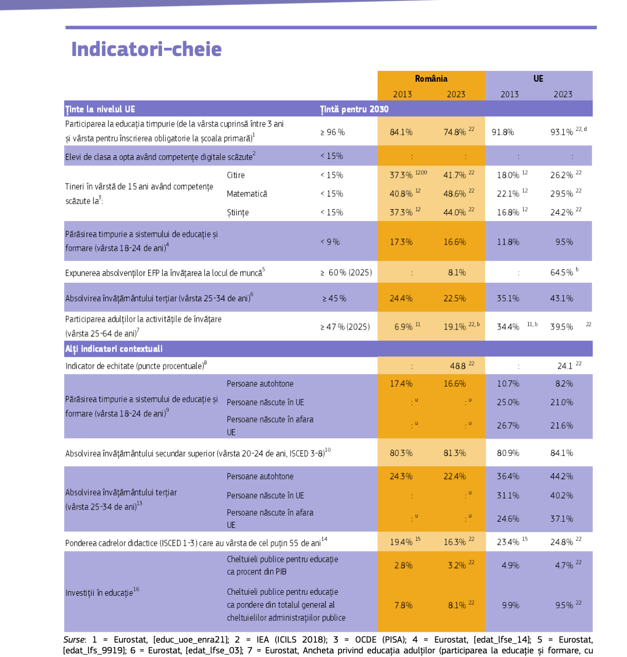 - Tineri cu vârsta de 15 ani cu competențe scăzute la citire, matematică, științe – PISA (ținta UE: sub 15% în 2030)