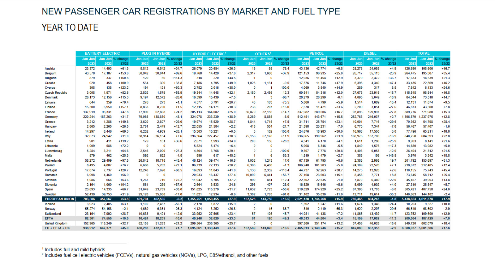 „Înmatriculările de mașini noi hibrid-electrice au crescut cu 32,4% în iunie, ajungând la 254.100 de unități. Această creștere a fost determinată în principal de creșterile substanțiale înregistrate pe cele mai mari piețe ale blocului: Germania (+59,1%), Italia (+29,9%), Franța (+27,9%) și Spania (+22,7%). În mod cumulat, hibrid- electricele au înregistrat o creștere remarcabilă de 27,9% din ianuarie până în iunie, ajungând la aproape 1,4 milioane de unități și acaparând 25% din piață.
