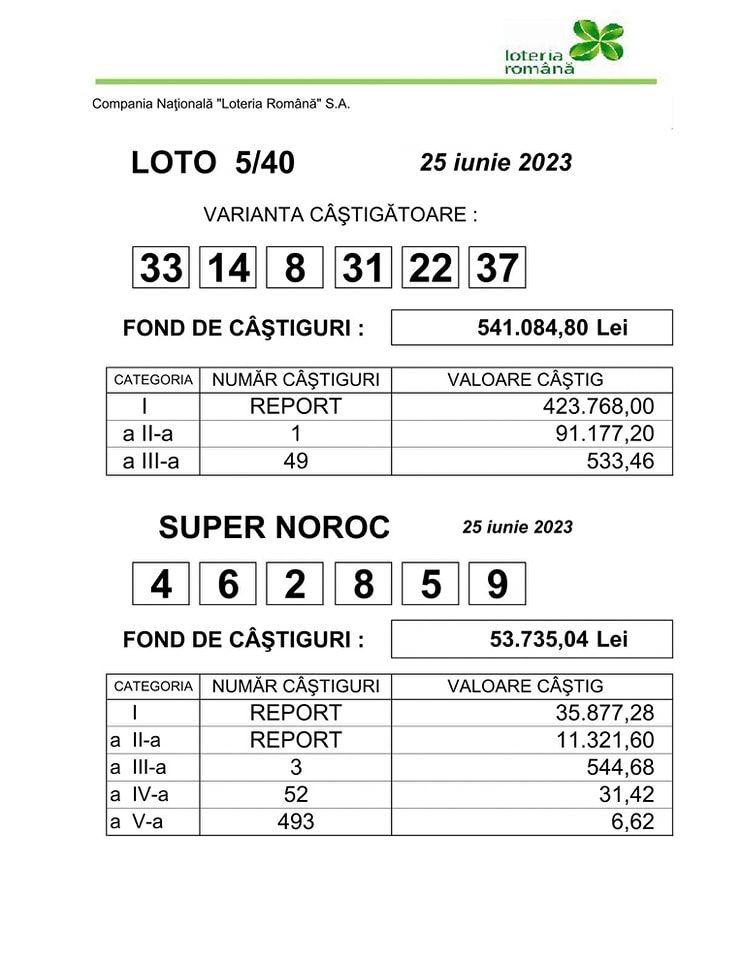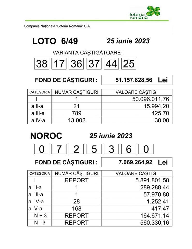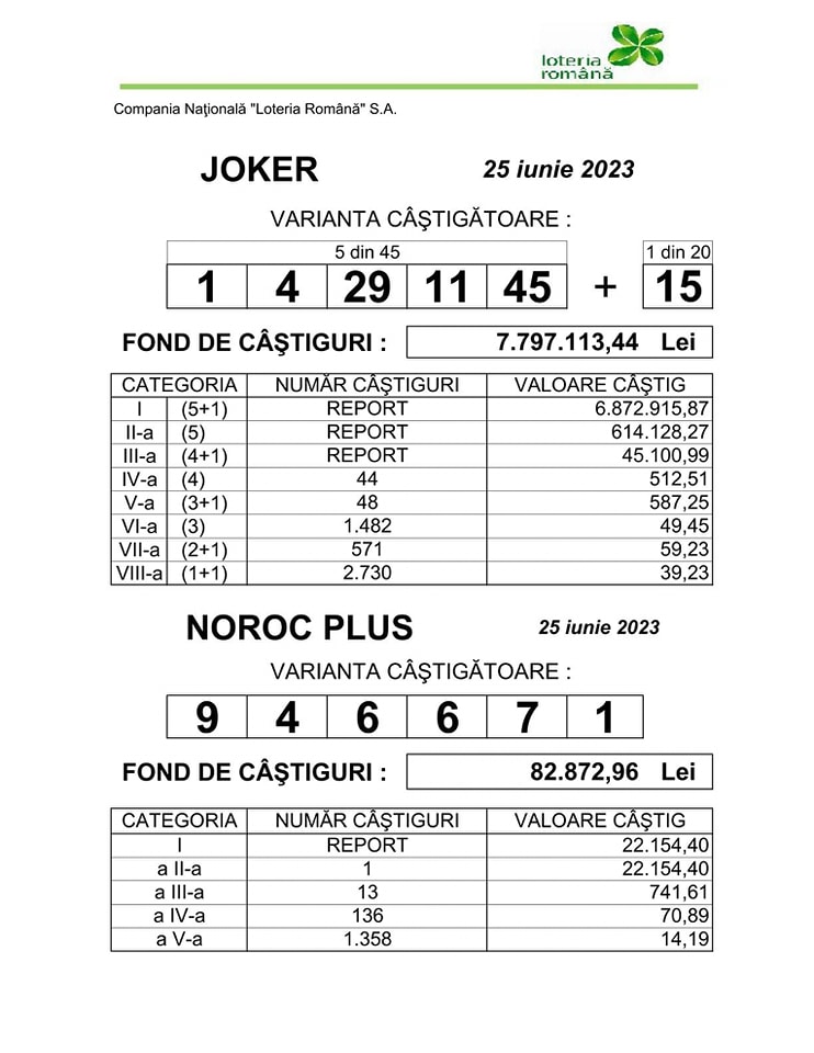 Mai mult, la tragerea NOROC s-a câștigat un premiu la categoria a II-a în valoare de 289.288,44 de lei. Biletul norocos a fost jucat la o agenție din județul Vrancea. La același joc s-a câștigat și premiul la categoria a III-a în valoare de 57.970,80 de lei. Astfel, biletul norocos a fost jucat la o agenție din Galați.