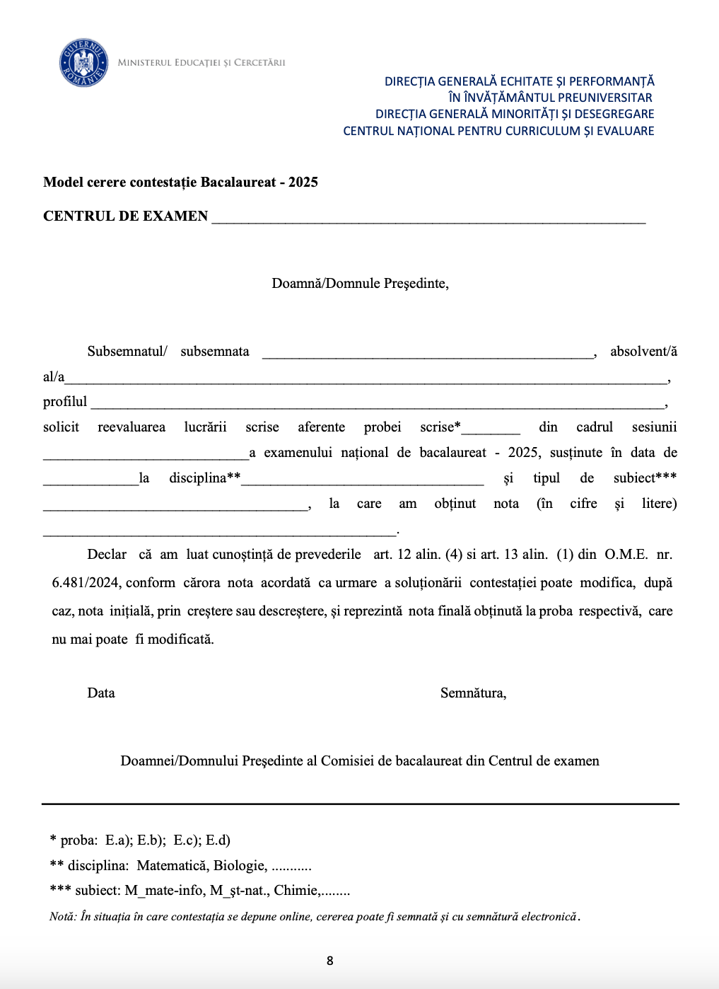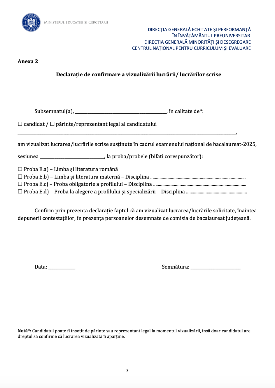 La finalul vizualizării, elevul și părintele (dacă este cazul) semnează o declarație de confirmare. Dacă elevul consideră că nota nu reflectă corect evaluarea, poate depune contestație în perioada 20–24 iunie. Formularul pentru contestație este disponibil online, iar elevii trebuie să semneze o declarație prin care își asumă faptul că nota poate fi modificată în orice direcție, inclusiv descrescător.