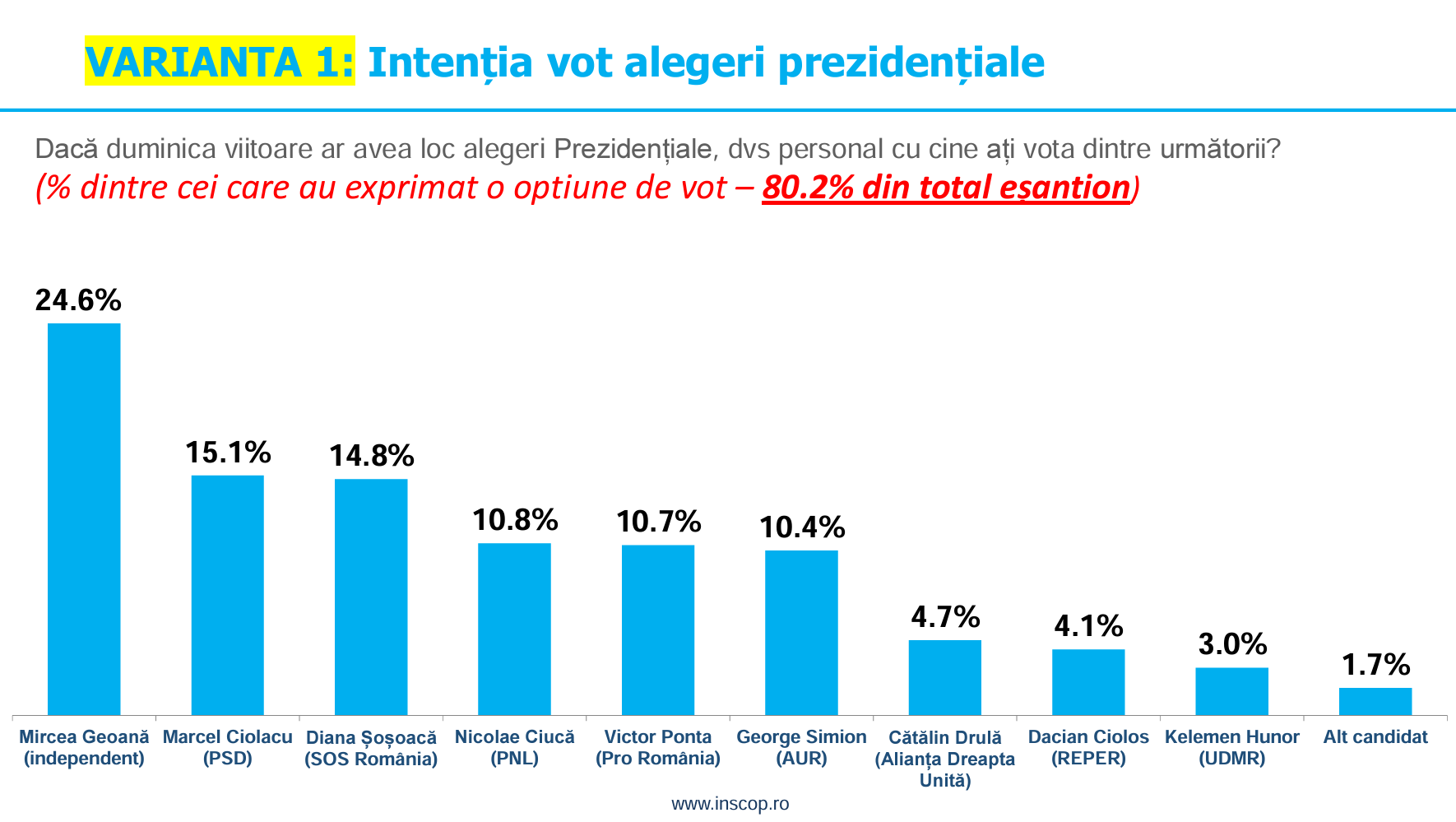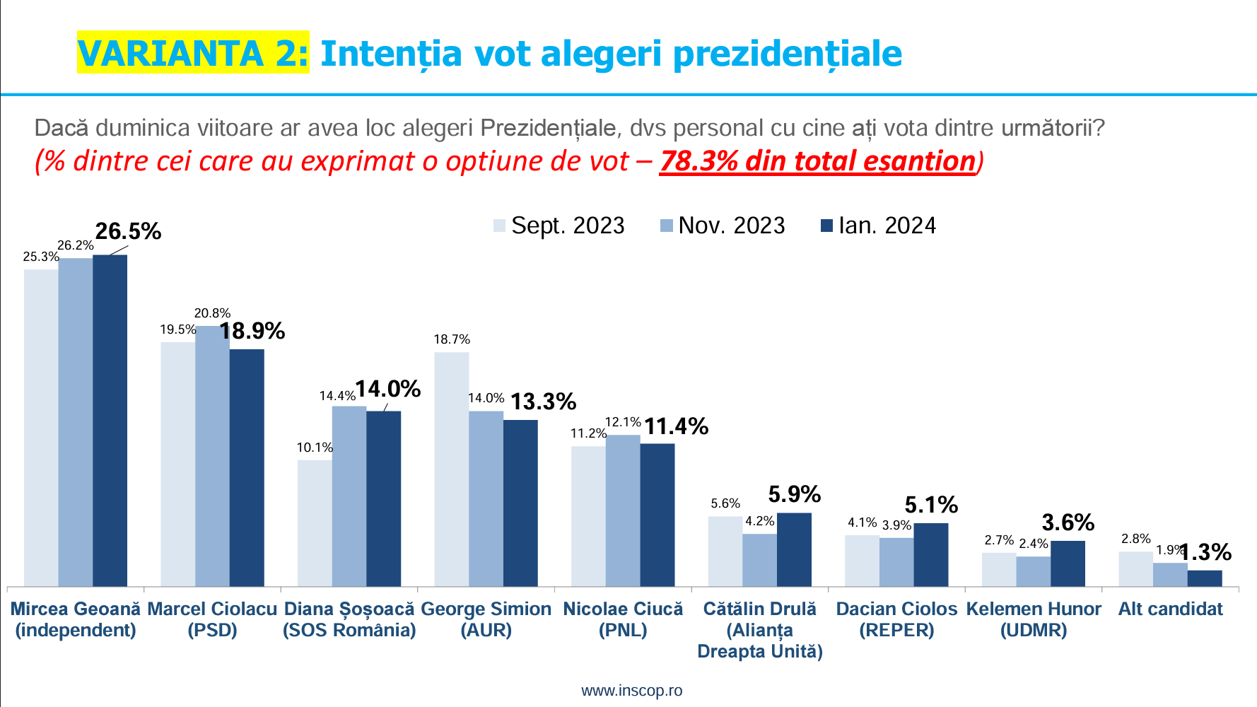 Potrivit sondajului pe luna ianuarie al INSCOP, patru din cinci români (80,2%) au o opțiune clară de vot la alegerile prezidențiale. Dintre aceștia, dacă duminica viitoare ar avea loc alegerile prezidențiale, 24,6% l-ar vota pe Mircea Geoană (candidat independent), 15,1% l-ar alege pe Marcel Ciolacu (PSD), iar 14,8% pe Diana Șoșoacă (SOS România). Celelalte opțiuni ar fi: Nicolae Ciucă (PNL) – 10,8%, Victor Ponta (Pro România) – 10,7%, George Simion (AUR) – 10,4%, Cătălin Drulă (Alianța Dreapta Unită) – 4,7%, Dacian Cioloș (REPER) – 4,1% și Kelemen Hunor (UDMR) – 3%. Doar 1,7% dintre români ar alege un alt candidat.