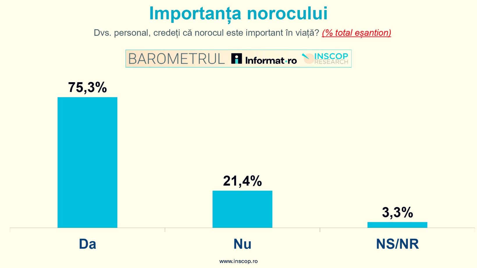 Potrivit cercetării, 75,3% dintre respondenți consideră norocul esențial, 21,4% nu îi acordă importanță, iar 3,3% nu au știut sau nu au răspuns. Aceeași tendință se regăsește în toate categoriile de vârstă: 74% dintre tinerii de 18-29 de ani și cei de 45-59 de ani consideră norocul important, procentul fiind ușor mai mare în rândul celor de 30-44 de ani și al celor peste 60 de ani, care ating 76-77%.