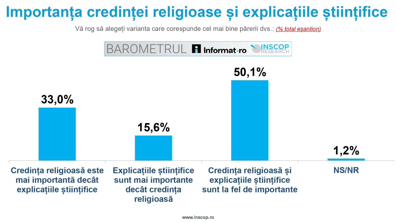 Referitor la credința religioasă versus explicațiile științifice, jumătate dintre români consideră că ambele sunt la fel de importante, 33% cred că religia este mai importantă, iar 15,6% cred că știința primează. Diferențele apar și aici după educație: 62% dintre cei cu doar clasele primare absolvite pun mai mult accent pe credință, în timp ce 37% dintre cei cu studii superioare consideră că explicațiile științifice sunt mai importante.