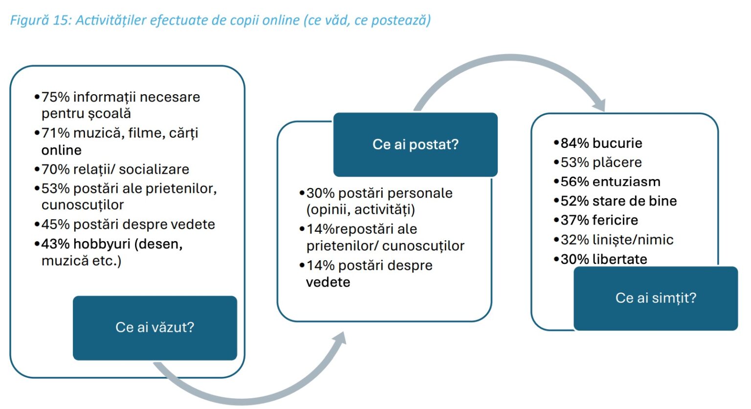 Potrivit raportului, „într-o zi de școală, elevii stau pe internet în medie 4 ore, iar în weekend peste 5 ore. Consumul digital este comparabil cu timpul petrecut cu familia și aproape dublu față de cel petrecut cu prietenii”. Jumătate dintre elevi folosesc cel mai mult Internetul seara, înainte de culcare, în locul altor activități recreative sau pregătitoare pentru somn.