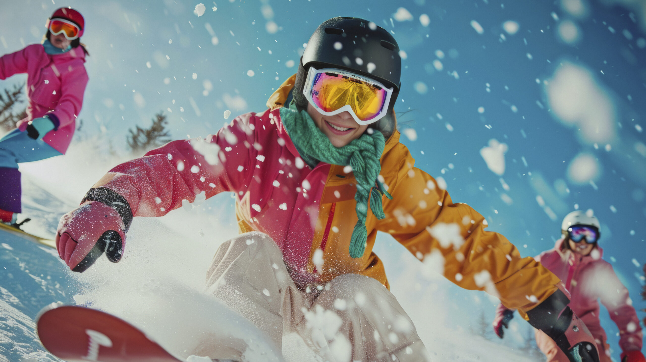 A diverse group of female snowboarders shredding through a vibrant, colorful terrain park, their dynamic movements and expressions captured in a cinematic, dreamlike style. cinematic photo, photography, with cinematic tones –ar 16:9 –style raw Job ID: e07ab21b-9cc3-4bf6-b63c-2fe97721bf77