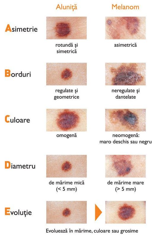 - D (Diametru): Leziuni mai mari de 6 mm, deși melanoamele pot fi și mai mici.