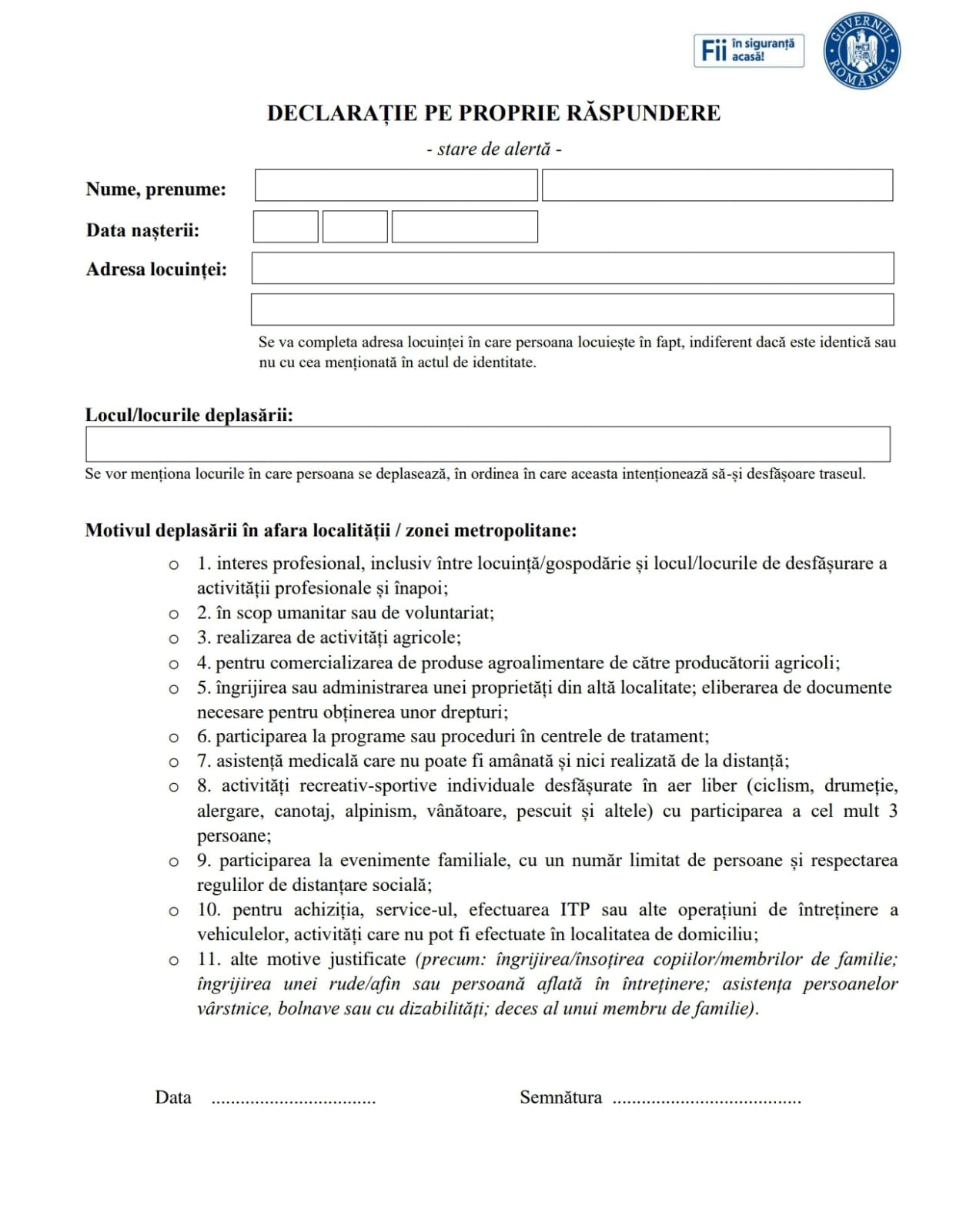 Odată cu trecerea în starea de alertă s-a renunțat la declarațiile pe proprie răspundere pentru deplasarea în interiorul domiciliului. Totuși, dacă vă gândiți să părăsiți localitatea în care vă aveți domiciliul, trebuie să știți că o puteți face doar pentru unele motive și aveți nevoie de declarație pe proprie răspundere.
