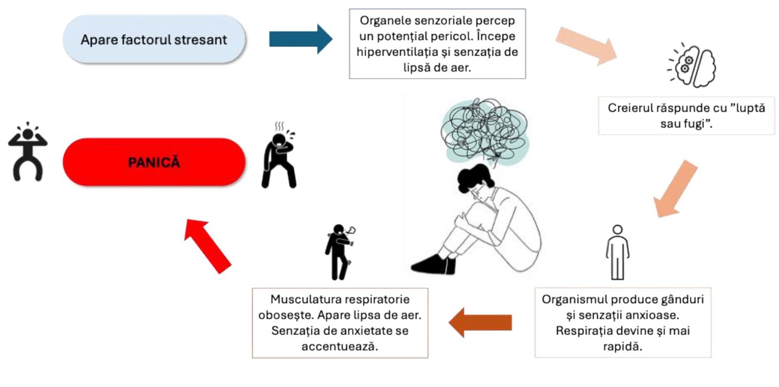 - Respirație și mai superficială – pe măsură ce senzațiile de anxietate se accentuează, respirația devine și mai rapidă și mai superficială, exacerbând hiperventilaţia și adâncind ciclul
