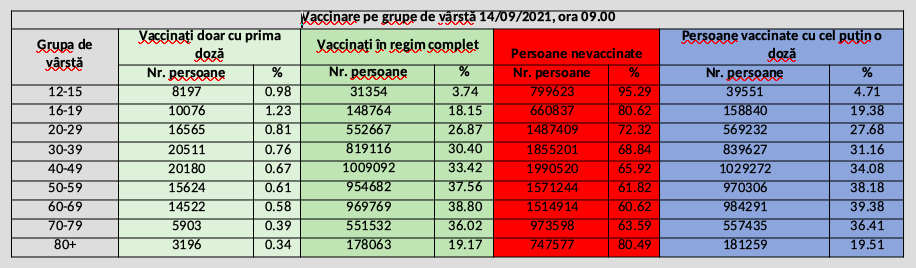 Conform categoriilor de vârstă, cel mai mare procent de vaccinați cu schema completă în România a fost înregistrat la grupa de vârstă între 60 și 69 de ani (38,8%), iar cel mai mic procent este la copiii cu vârste între 12 și 15 ani (3,7%). În plus, sub 20% din populația României care are peste 80 de ani este vaccinată anti-Covid.