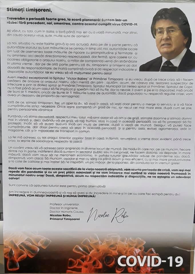 Primarul Timișoarei a lăsat un mesaj kilometric pe o scrisoare adresată timișorenilor, pe care tinerii din PNL au lipit-o voluntar, atât pe geamurile farmaciilor, cât și în scările de bloc din oraș. Nicolae Robu le vorbește oamenilor despre perioada grea pe care o traversăm „la scară planetară” și le dă sfaturi în plină pandemie de coronavirus.