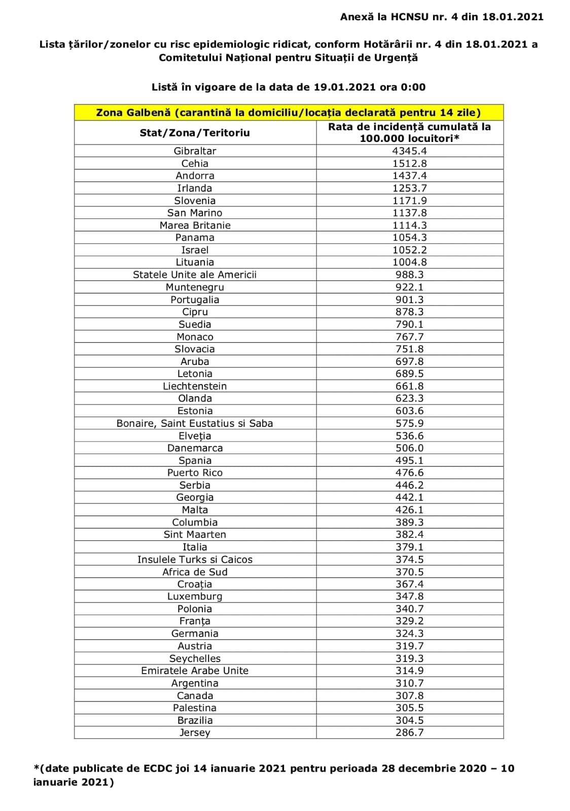 - Aprobarea listei țărilor/zonelor/teritoriilor de risc epidemiologic pentru care se instituie măsura carantinei asupra persoanelor care sosesc în România, listă valabilă începând cu data 19.01.2021, ora 0:00.