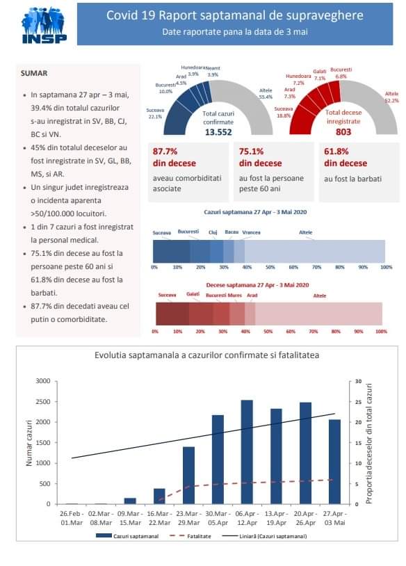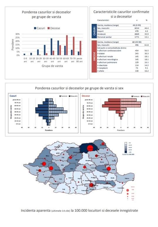 Conform raportului INSP, 75,1% dintre decesele persoanelor cu COVID-19 au fost în cazul celor peste 60 de ani, iar 61,8% au fost în cazul bărbaților. Conform aceluiași raport, unul din șapte cazuri a fost înregistrat în rândul personalului medical.
