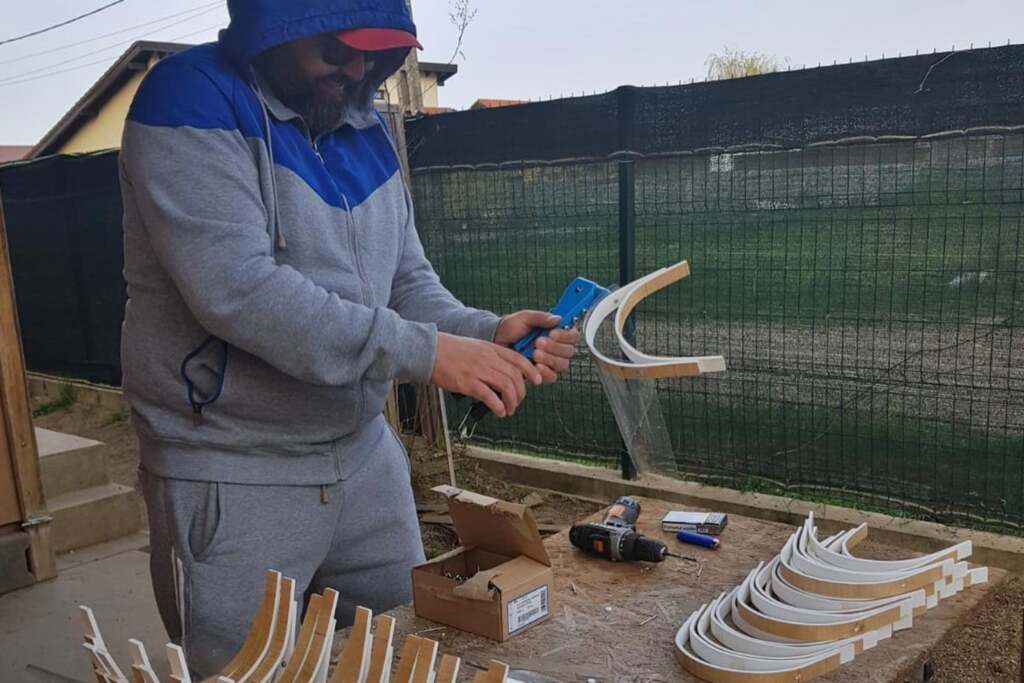 Ovidiu a făcut și viziere pentru doctori, aproximativ 1.500 până acum, dar nu a mai găsit material pentru astfel de materiale de protecție. Așa că acum face porți pentru decontaminare.