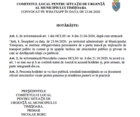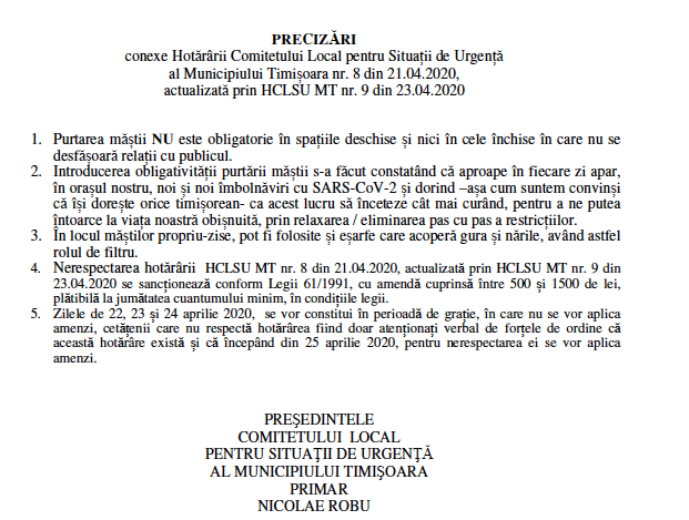 „Începând cu data de 23.04.2020, pe teritoriul administrativ al Municipiului Timișoara, se instituie obligativitatea persoanelor de a purta mască pe mijloacele de transport public în comun și în spațiile închise ale structurilor publice și private în care se desfășoară relații cu publicul”.