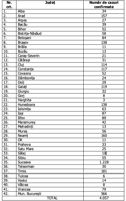 Până luni, 6 aprilie, pe teritoriul României au fost confirmate 4.057 de cazuri de persoane infectate cu virusul COVID – 19 (coronavirus). Duminică, în România au fost semnalate 3.864 de cazuri.