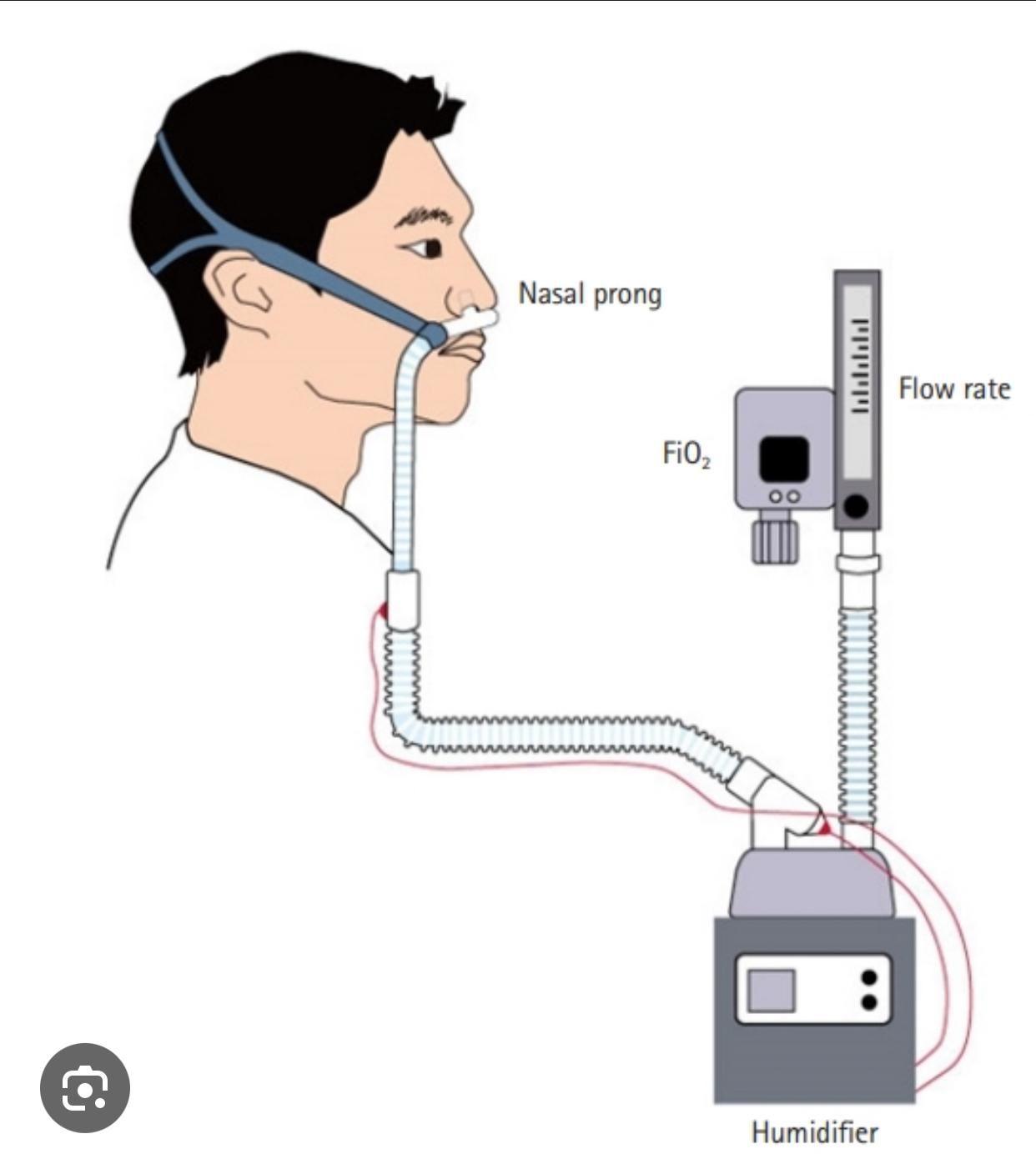 - fluxul mare de gaz (aer + oxigen) ajută la reducerea efortului respirator prin „spălarea” dioxidului de carbon din căile respiratorii superioare