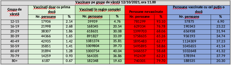 Raportat la categorii de vârstă, cei mai mulți vaccinați cu schema completă în România sunt cei cu vârste cuprinse între 60 și 69 de ani (40%), iar cei mai puțini sunt copiii cu vârste între 12 și 15 ani (4,7%).