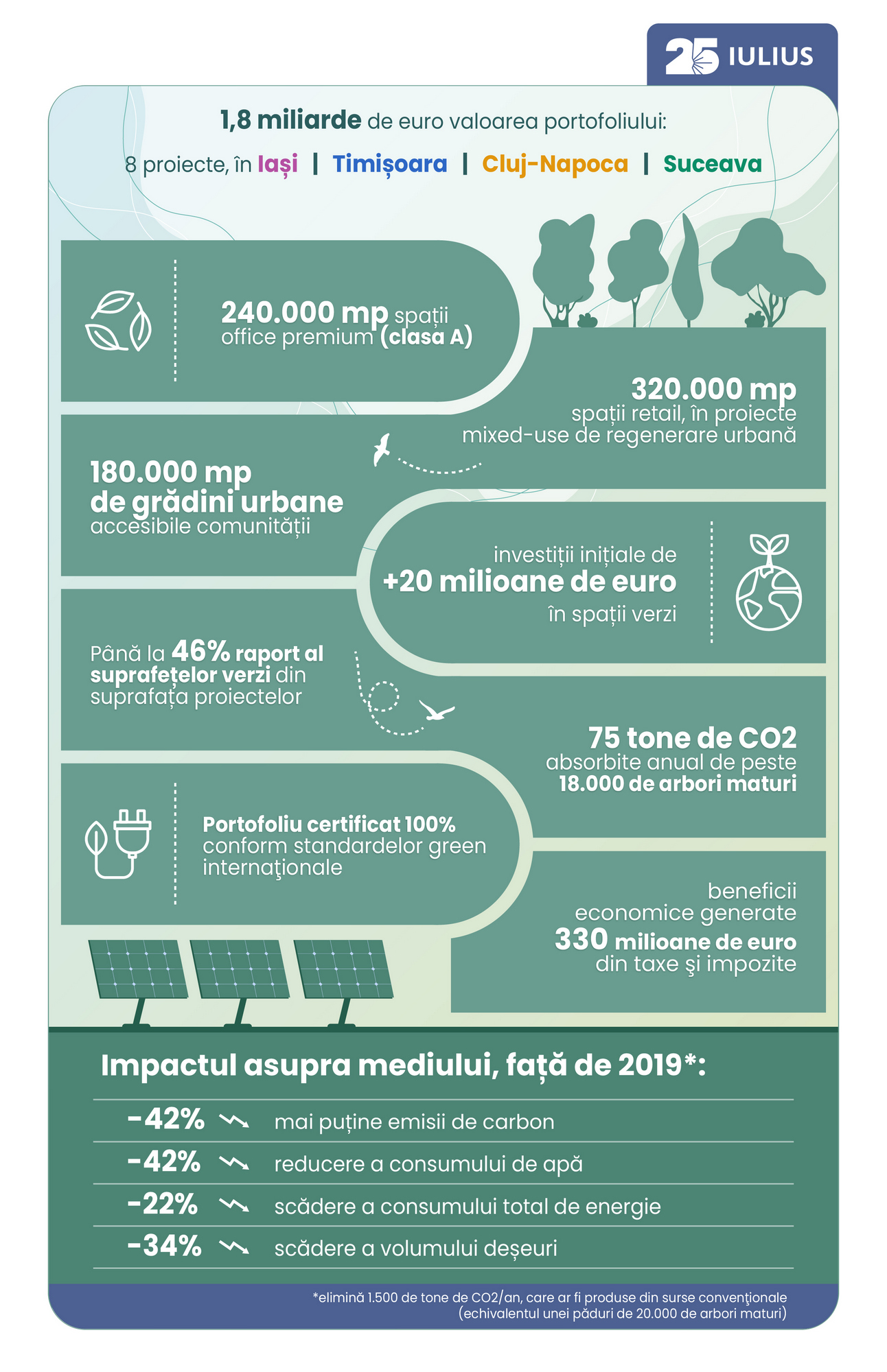 Proiectele IULIUS sunt concepte sustenabile, care integrează grădini ample, aducând natura în mijlocul orașelor, între oameni – 14 hectare de grădini urbane în Iași, Timișoara și Cluj-Napoca, cu 80.000 de arbori și arbuști și investiții de 20 milioane euro. Prin conceptele lor, investițiile companiei își aduc aportul nu doar la dezvoltarea urbană și economică, ci și din perspectivă culturală și socială, devenind destinații ce oferă experiențe variante, pentru toate vârstele, tot timpul anului – peste 1.000 de evenimente anual, inclusiv ca parteneriate cu mediul artistic și cultural local.